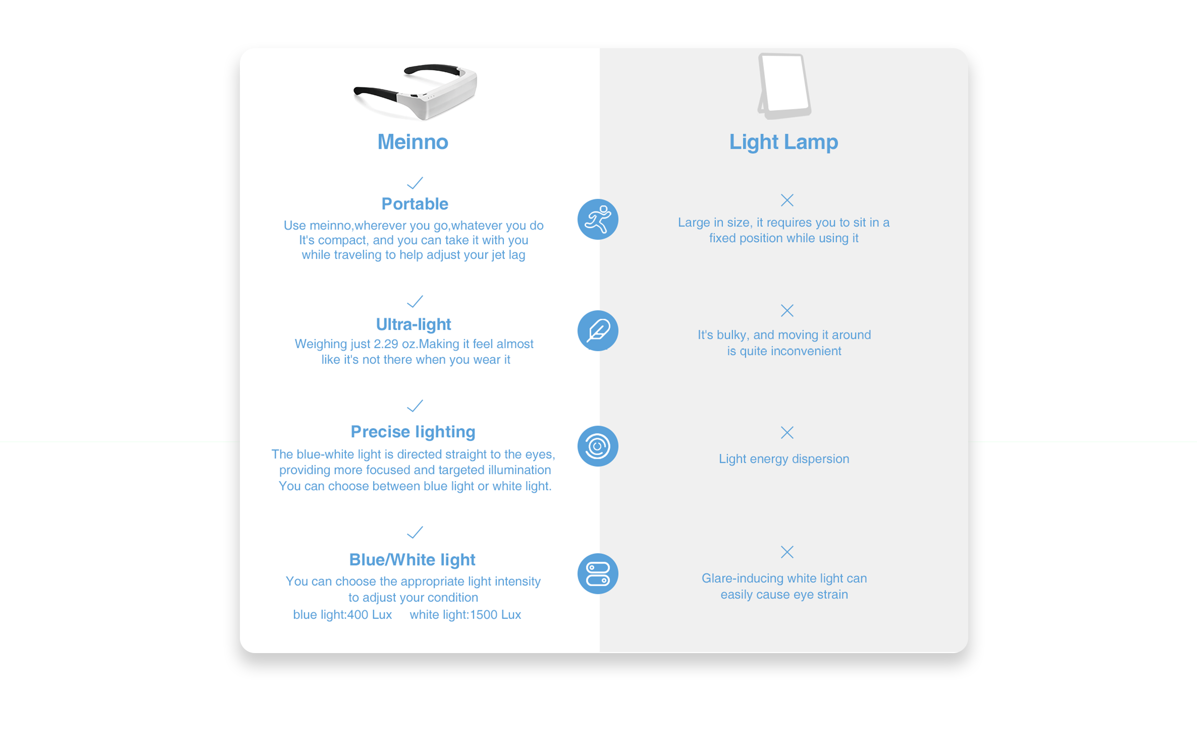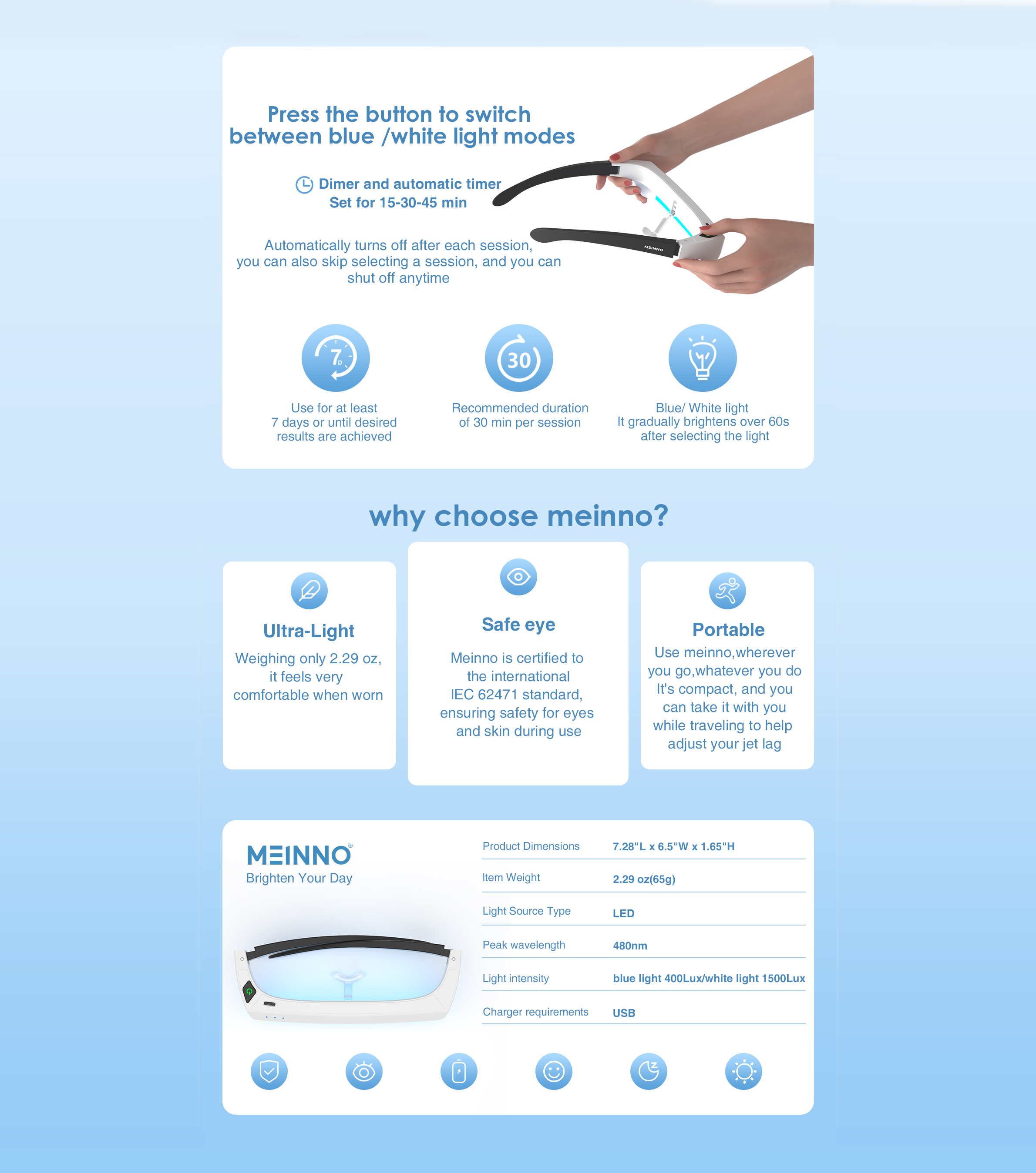 Experience the benefits of light therapy with Meinno's portable glasses. Designed to improve mood and combat seasonal affective disorder (SAD), these glasses feature safe, UV-free wavelengths that mimic natural sunlight. Elevate your well-being with Meinno—your go-to solution for brighter days.